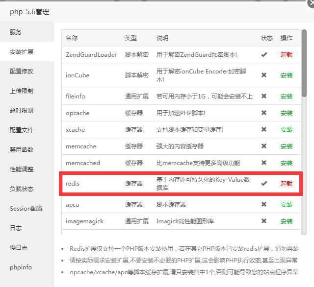 寶塔面板——軟件管理——運行環(huán)境——php5.6(選擇你使用的版本號)——安裝擴展——Redis——安裝。
