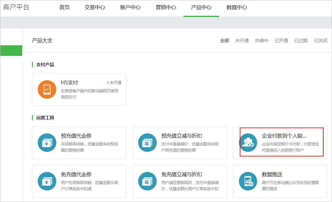 管理員安裝證書后登錄商戶平臺,點擊【產(chǎn)品中心】—>【企業(yè)付款到個人銀行卡】點擊申請開通;