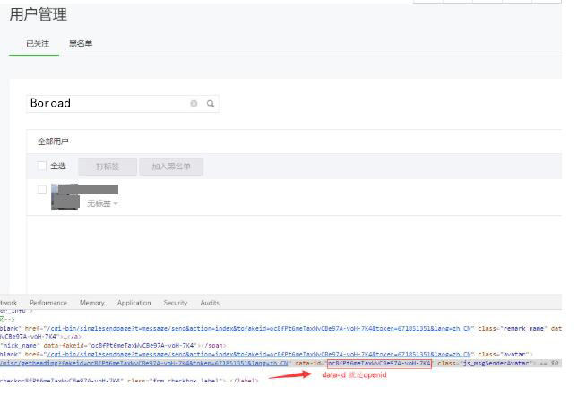 首先關(guān)注公眾號,在公眾號中點用戶管理,找到需要轉(zhuǎn)賬的用戶,點頭像右鍵審查元素,data-id就是openid